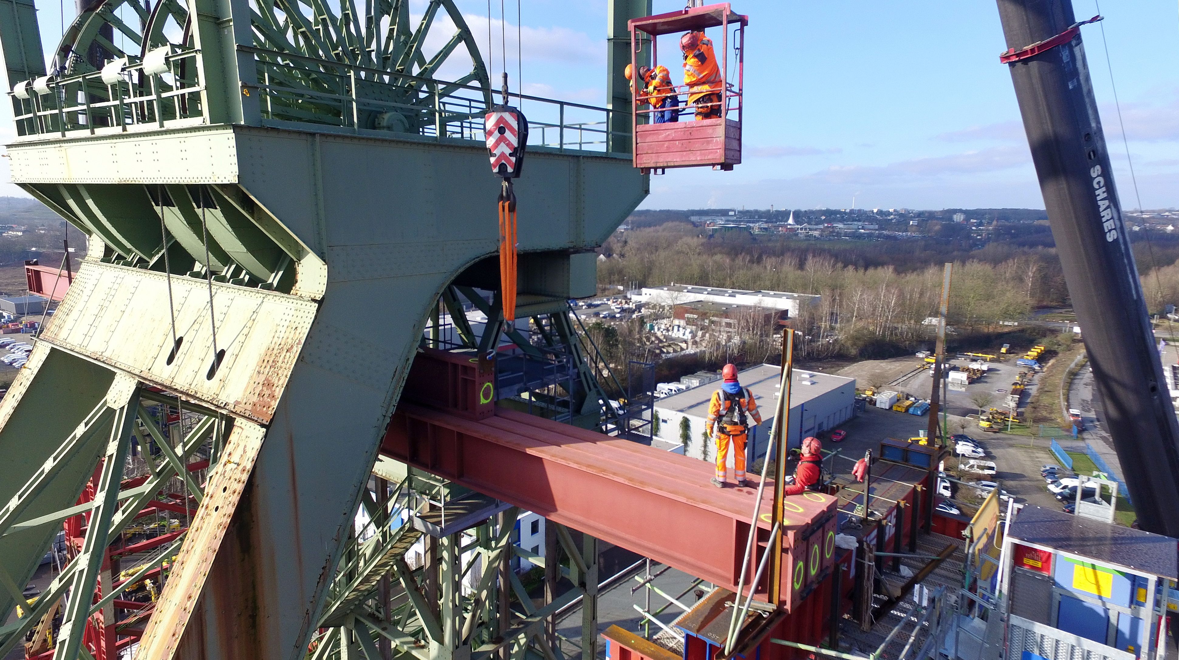 Durch die Errichtung des Abfanggerüstes und die Traversen werden die Lasten, für die das alte Fördergerüst keine ausreichende Traglastreserven verfügt, seitlich neben dem vorhandenen Schacht Arnold abgeleitet.